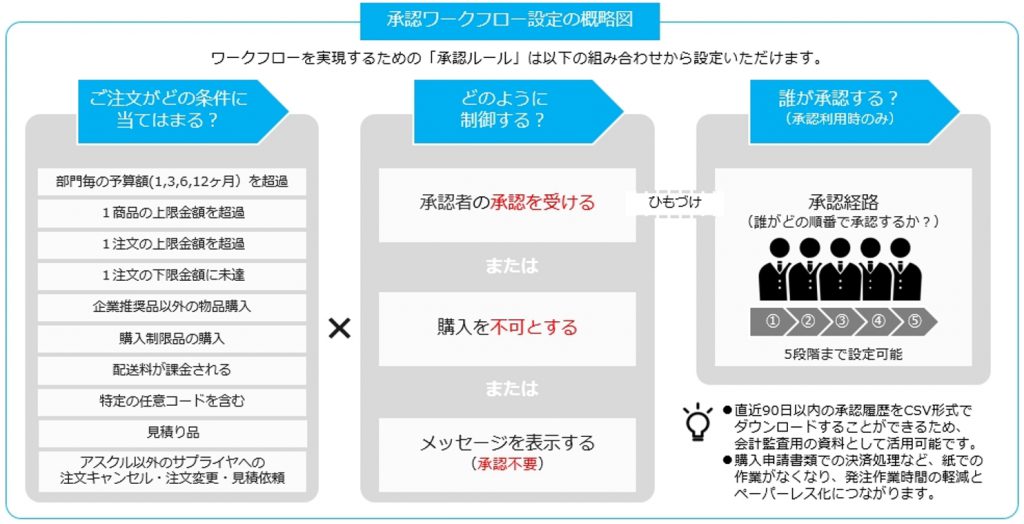 「承認ワークフロー」では、ご注文の内容が特定の条件に該当した場合、自動的に注文制御を行います。制御の手順は次の様に設定します。